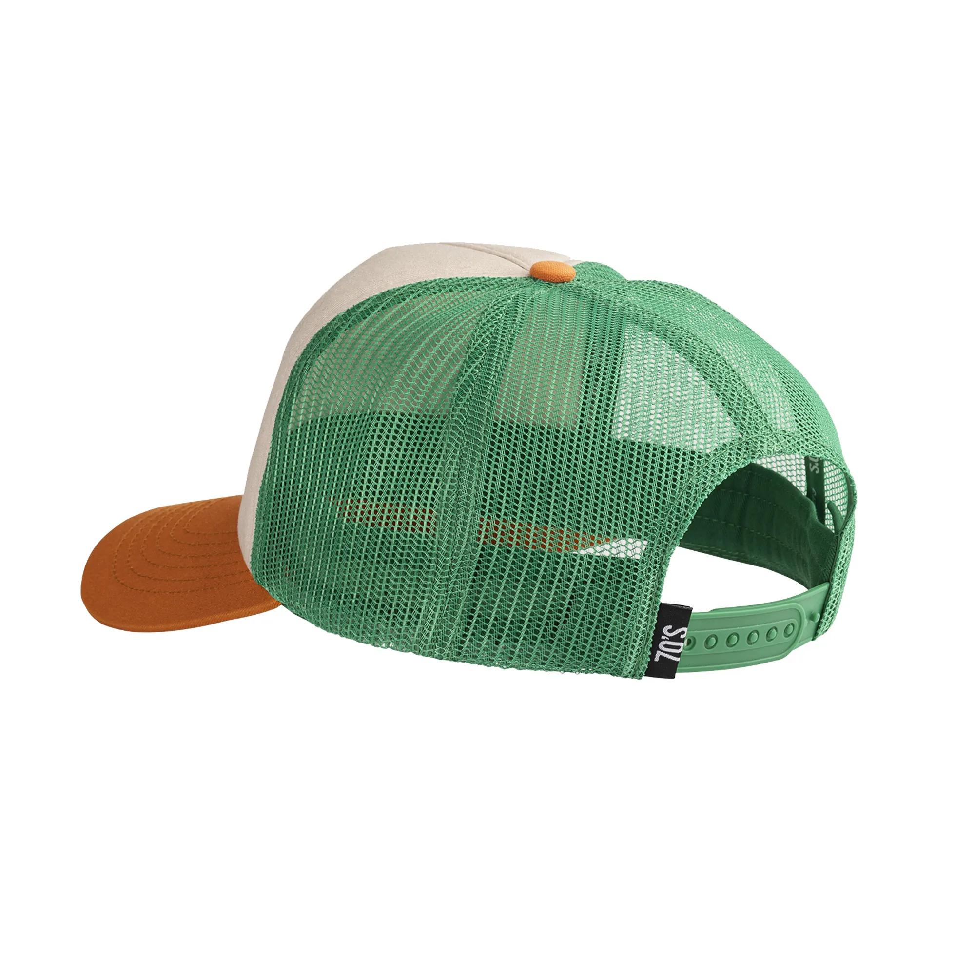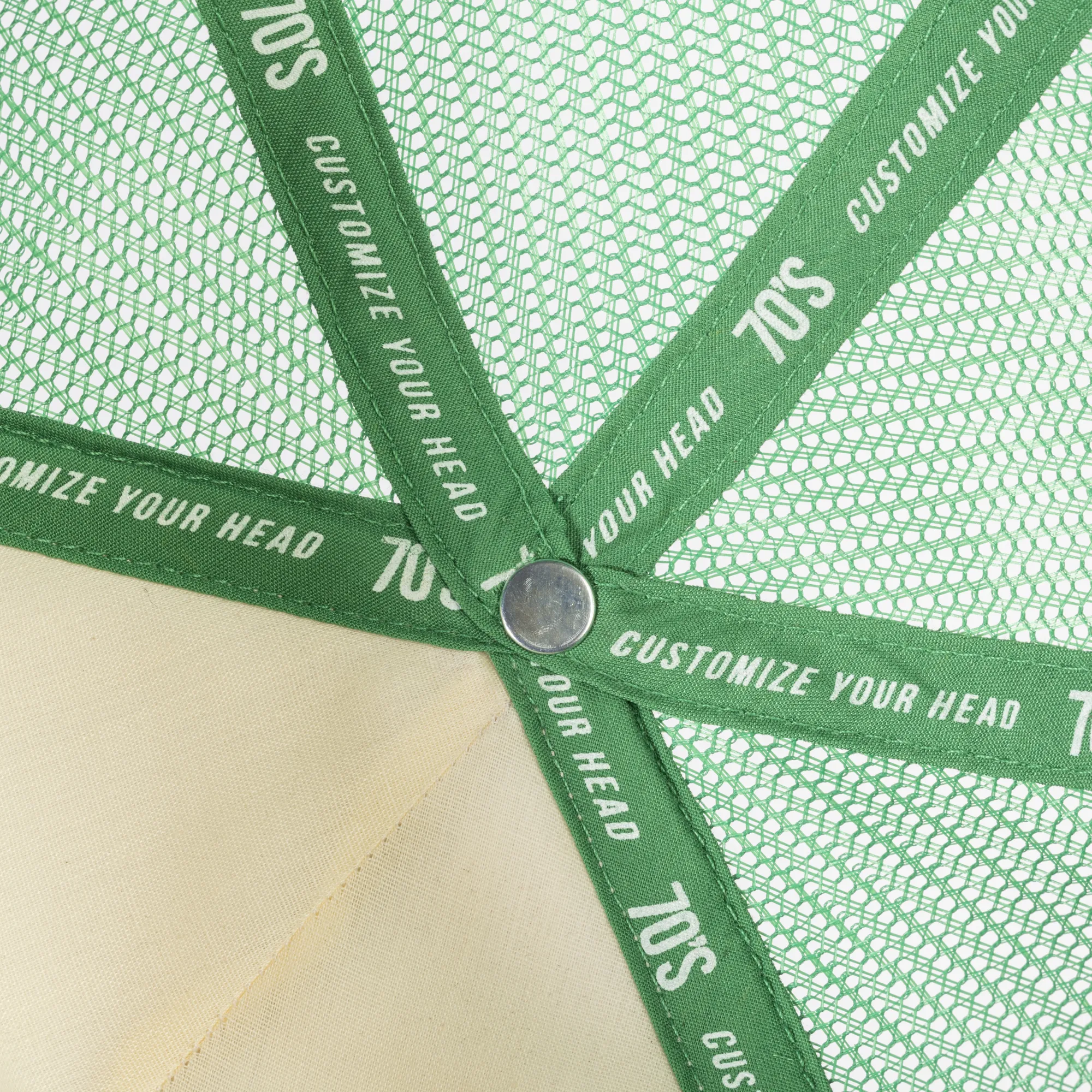 Trucker-Cap im Stil der 70er, großer gebogener Schirm, Stickerei auf dem Einsatz, Netzrücken, verstellbarer Rückenverschluss