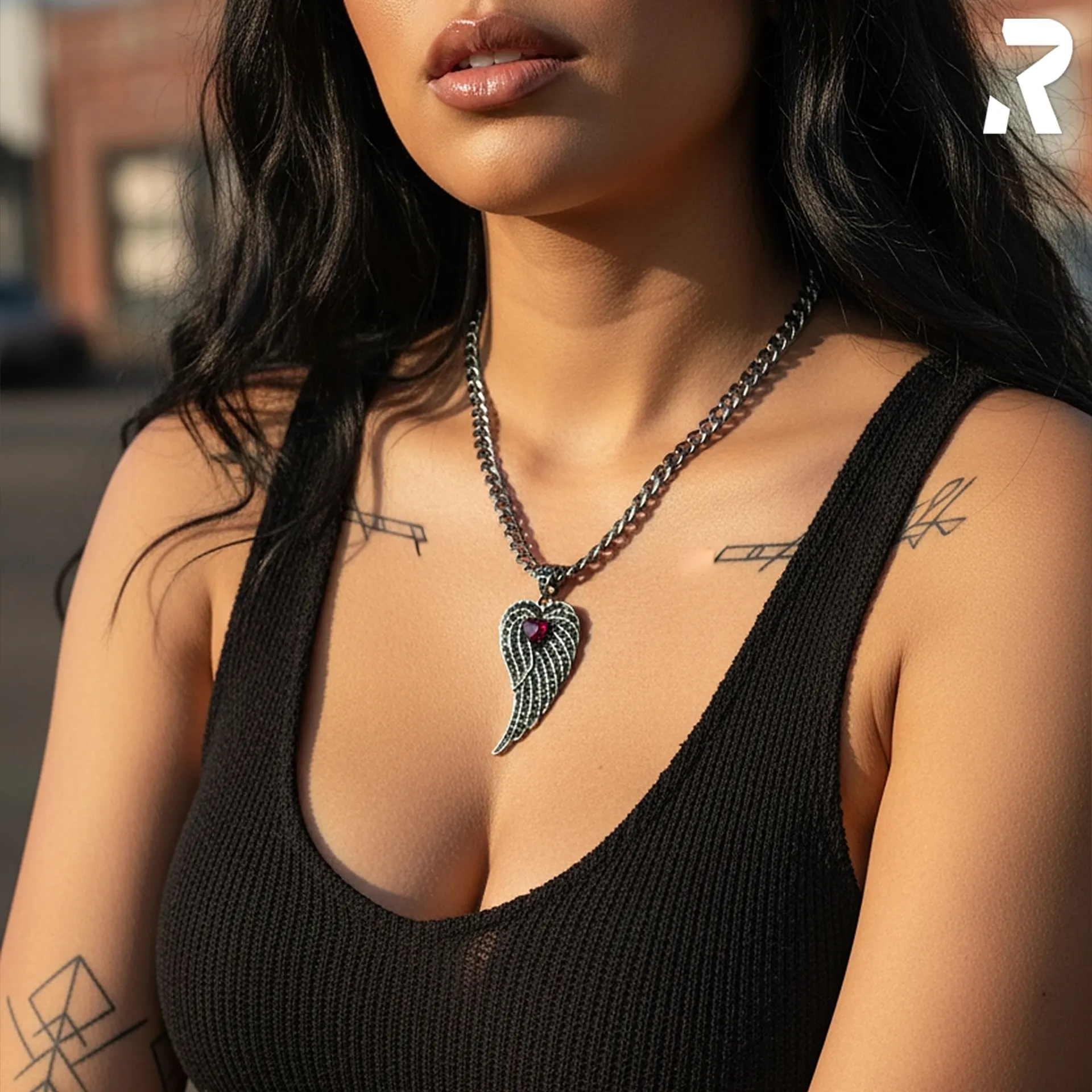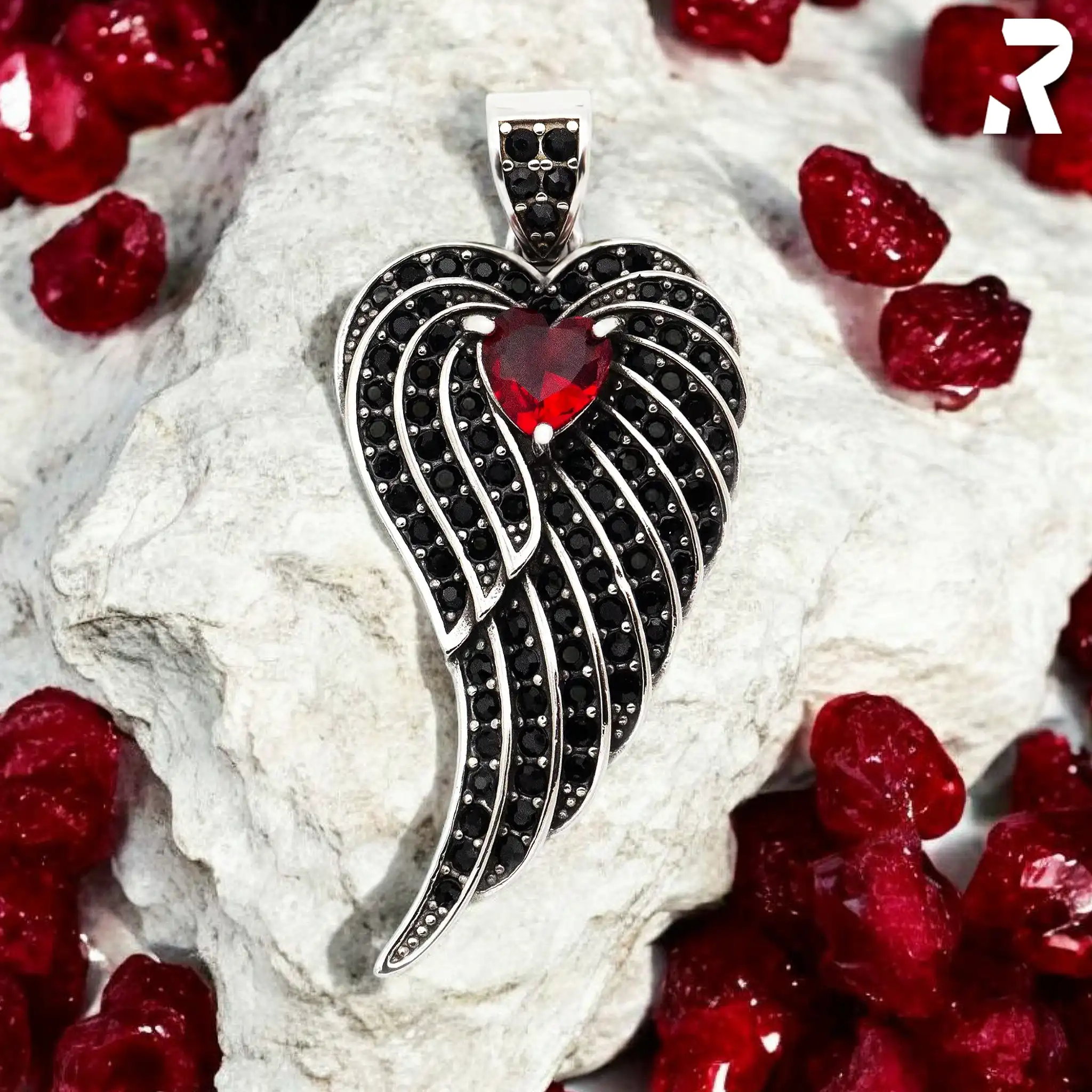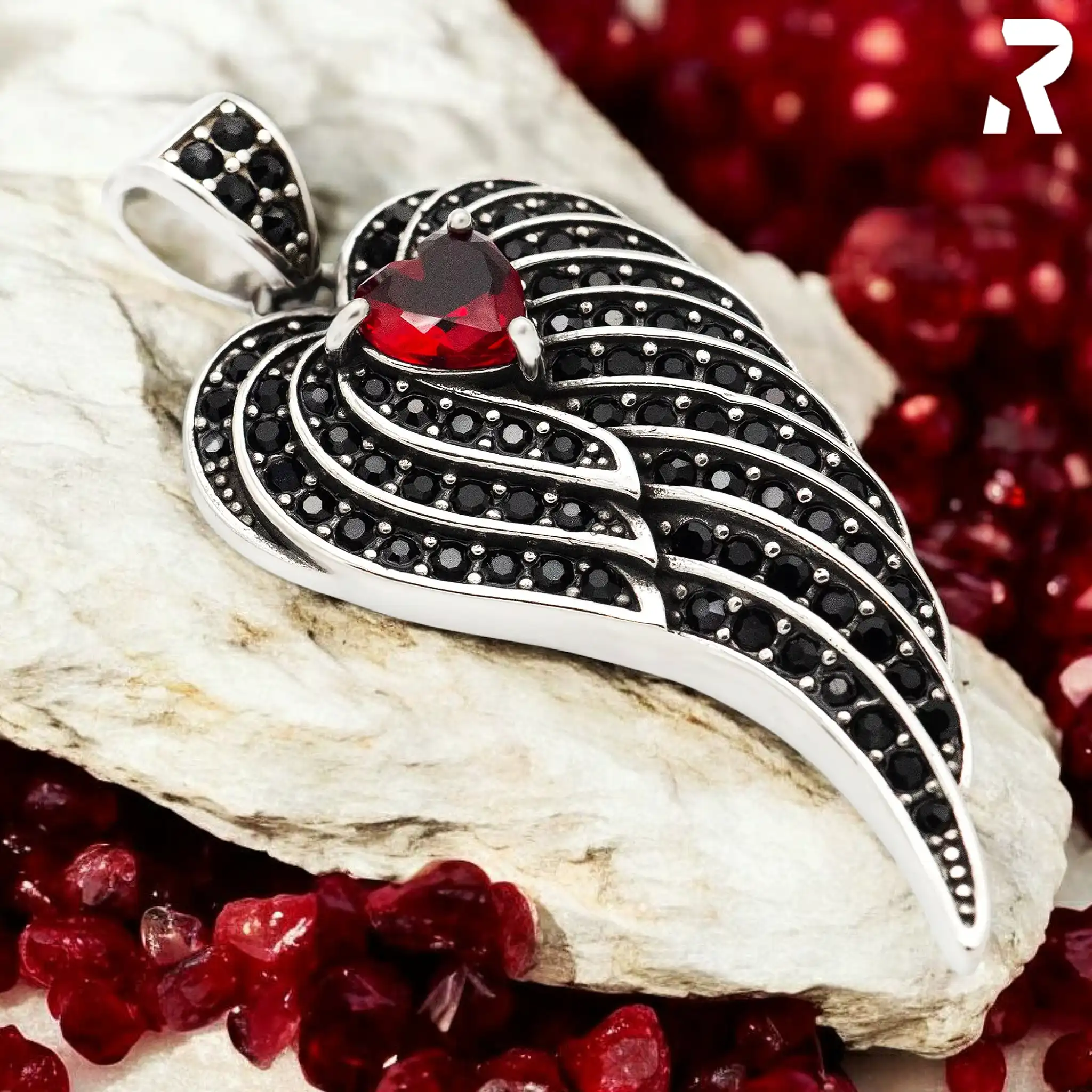 Ein zentraler roter Herzstein im Trillion-Schliff (Toms ästhetische Vision), umgeben von vielen, dicht gesetzten schwarzen Schmucksteinen in Pavé-Fassung (Klaus’ Verarbeitungsstandard), eingebettet in ein geschwungenes Flügel-Design aus hochglanzpoliertem Edelstahl (Willis Werkstatt-Romantik), das tatsächlich Blicke anzieht (Kevins Praxistest).