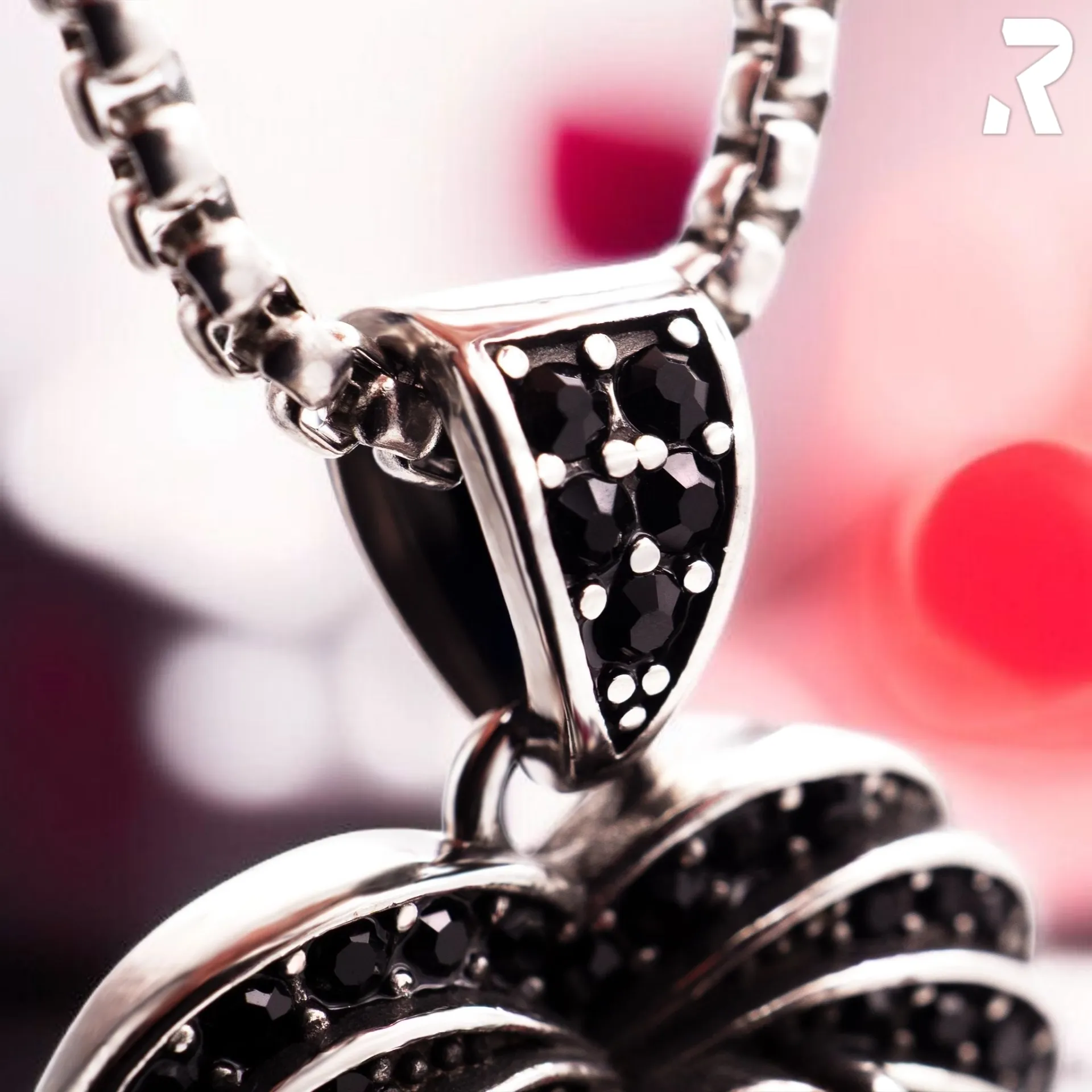 Das zentrale Herz ist nicht subtil. Rot. Groß. Geschliffen im Trillion-Schnitt – drei Seiten, scharfe Kanten, maximale Lichtbrechung. Drumherum: Zahlreiche schwarze Schmucksteine in Pavé-Fassung. Dicht gesetzt. Keine Lücken. Keine Symmetrie-Fehler.