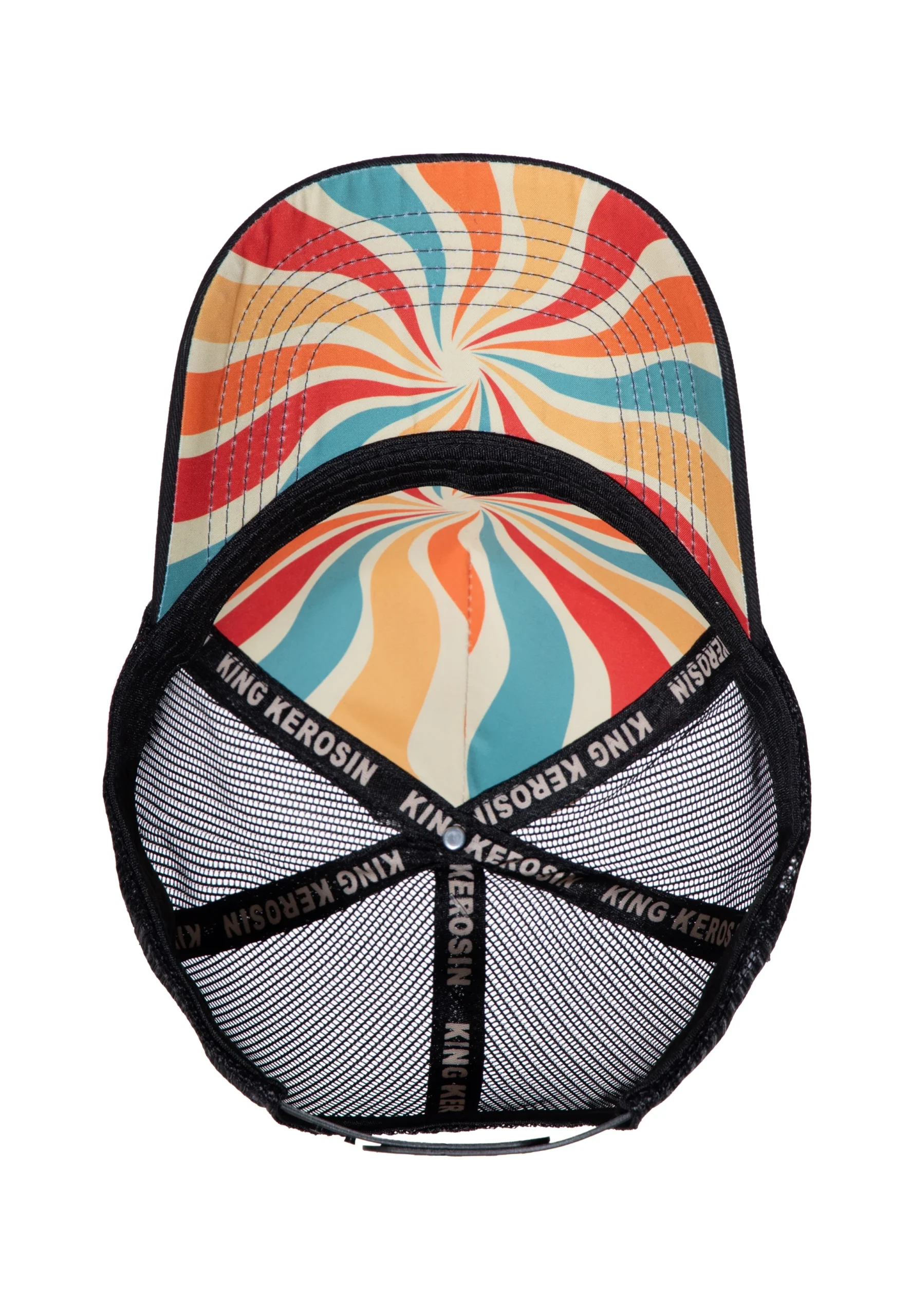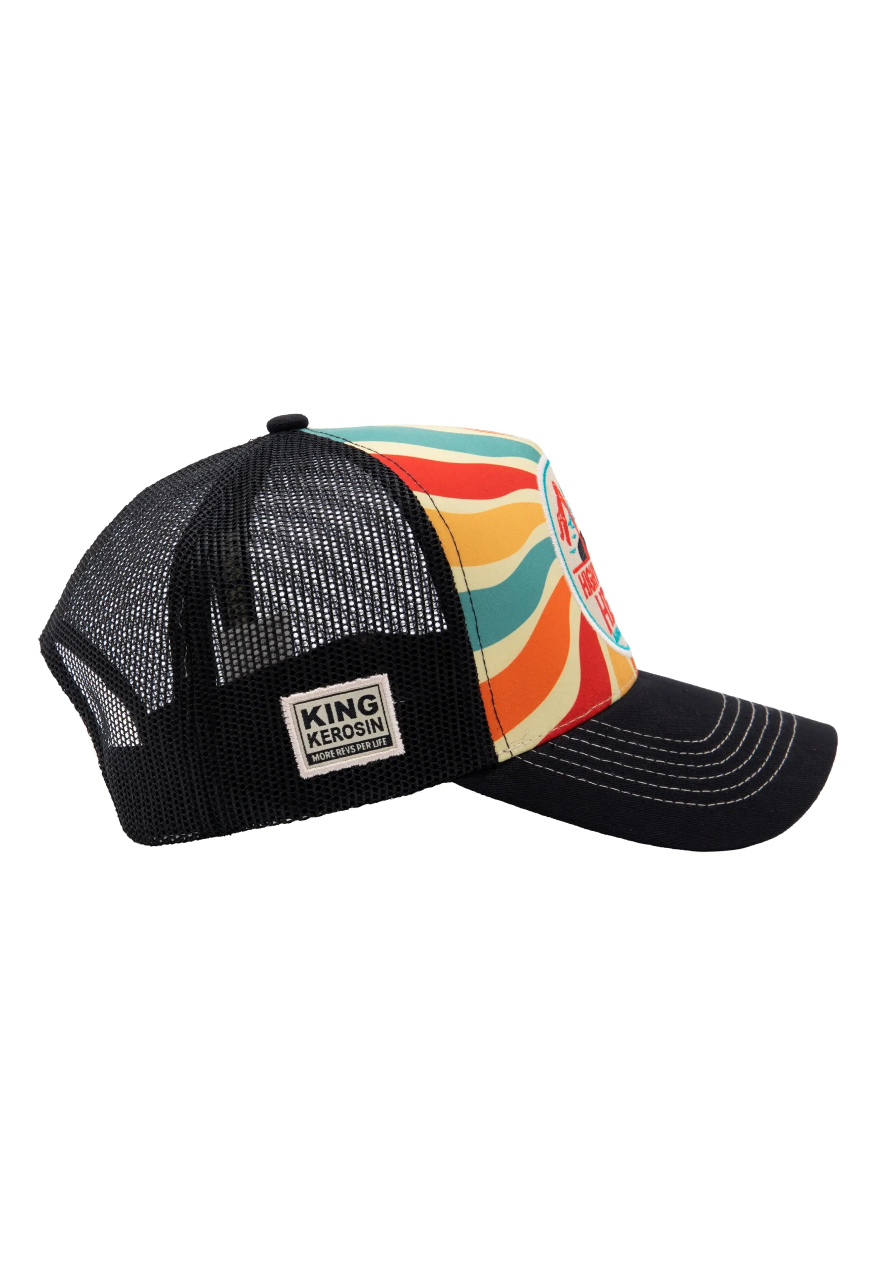 Kräftige Farben, dynamische Wellen und der Geist des Seventies-Chopper-Lifestyles – diese King Kerosin Trucker Cap bringt echtes Retro-Feeling und freie Straßen direkt in deinen Look. Der gebogene Schirm greift das farbenfrohe Design auf und überrascht auf der Unterseite mit fortgeführtem Print. Die Mesh-Rückseite sorgt für Luftigkeit, während gebrandete King-Kerosin-Nahtbänder im Inneren den hochwertigen Gesamteindruck abrunden. Eine Cap für alle, die den Seventies-Spirit und Chopper-Lifestyle leben – auf der Straße wie im Alltag.