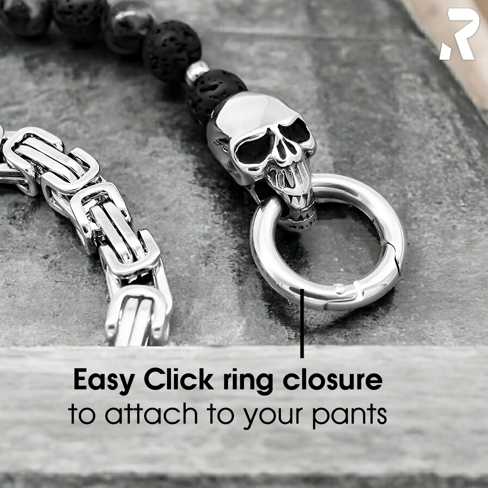 Zudem bringt unser Dual System der Hosenkette für Biker den Vorteil mit sich, dass sich eine Königskette besser einstecken lässt als eine Perlenkette. Ein Befestigen an deiner Brieftasche ist also kein Problem. Mit den 2 Karabinerringen kannst du die Hosenkette spielend leicht an der Hose und an deiner Brieftasche befestigen.