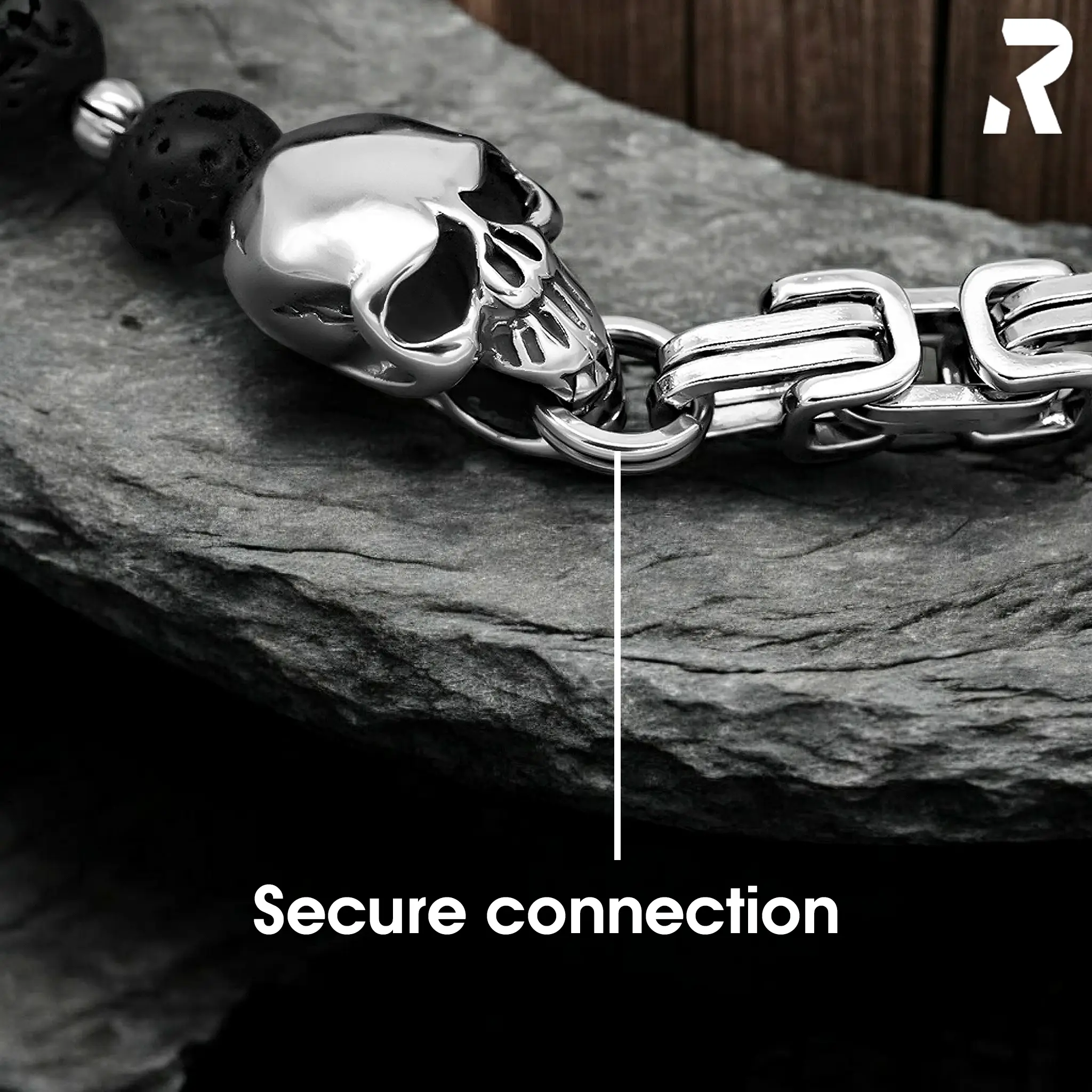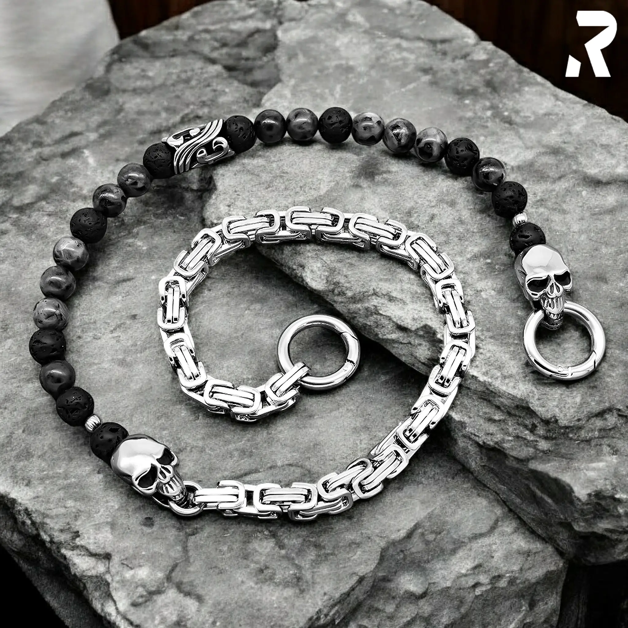 Mit dem einzigartigem Dual Design by Rockyfy trägst du einen Hosenketten Look, den kaum jemand hat. Von Vorne sieht man die Perlenkette, von Hinten die Königskette. Die schönen matt schwarzen Lava Steinperlen stehen im Wechselspiel mit den grauen Labradorit Edelsteinperlen. Die geometrische Anordnung der Steine sowie der generell graue Look passt ideal in die Bikerszene und ist für alle Rocker ein ansprechendes Accessoires.